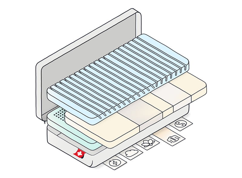 Statt eines einfachen Matratzenkerns oder fest verklebter Schichten ohne signifikanten Mehrwert basiert unsere gesundheitsorientierte Schlaftechnologie auf durchdachten Funktions- und Komfortschichten. Jede Schicht ist so gestaltet, dass sie die Vorteile eines Materials voll ausschöpft und einen speziellen Effekt erzielt, den Du Dir über die Anordnung innerhalb des Schlafsystems erschliessen kannst.